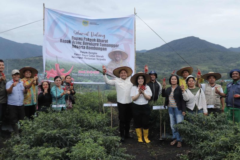 Pakpak Bharat, MNP – Bupati Pakpak Bharat, Franc Bernhard Tumanggor memetik cabai merah dalam “Panen Raya Cabai Merah Serentak” di Kawasan Pertanian Terpadu (KPT) desa Silima Kuta, kecamatan Sitellu Tali Urang Julu.