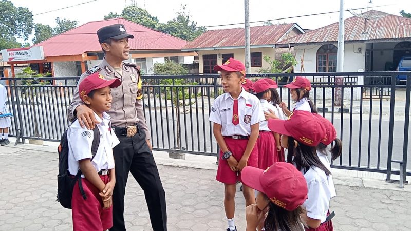 Samosir, MNP – Bripka Agus Sutopo, Personil Bhabinkamtibmas dari Polsek Simanindo, berinisiatif menyapa para pelajar di SD Negeri 15 Ambarita Kecamatan Simanindo Kabupaten Samosir.