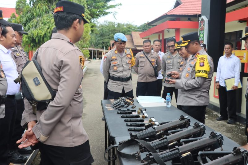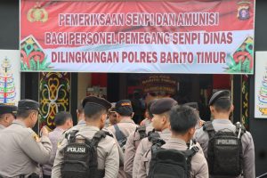 Barito Timur, MNP – Kapolres Barito Timur Polda Kalteng, AKBP Eddy Santoso, didampingi oleh Wakapolres Barito Timur dan jajaran Pejabat utama (PJU), Perwira, serta Kapolsek jajaran, melaksanakan kegiatan pengecekan senjata api (senpi) dinas di lingkungan Polres Barito Timur.