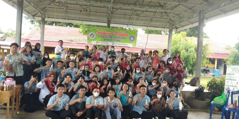 Barito Timur, MNP – Tim penggerak PKK Kabupaten Barito Timur melaksanakan kegiatan sosialisasi manfaat dan penggunaan dari Eco Enzym Nusantara kepada pelajar SMAN1 Tamiang Layang.