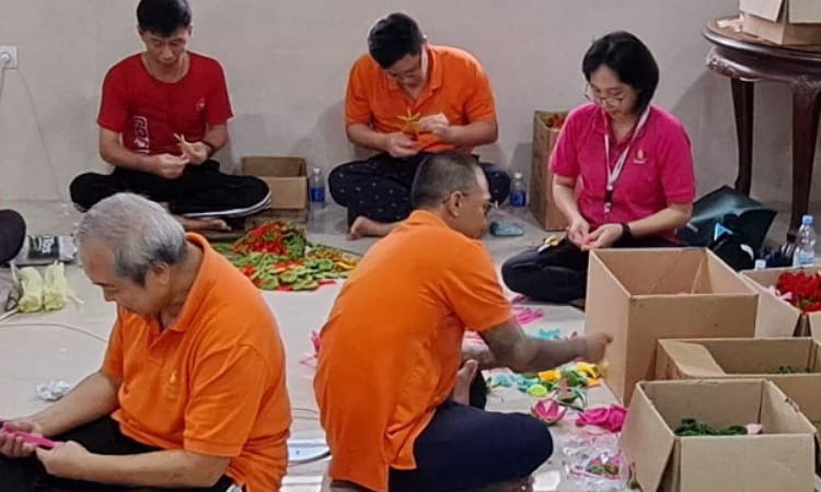 Dengan bahan sederhana seperti kawat bulu dan kertas warna, mereka membentuk bunga teratai—simbol kesucian, ketekunan, dan harapan dalam ajaran Buddha.