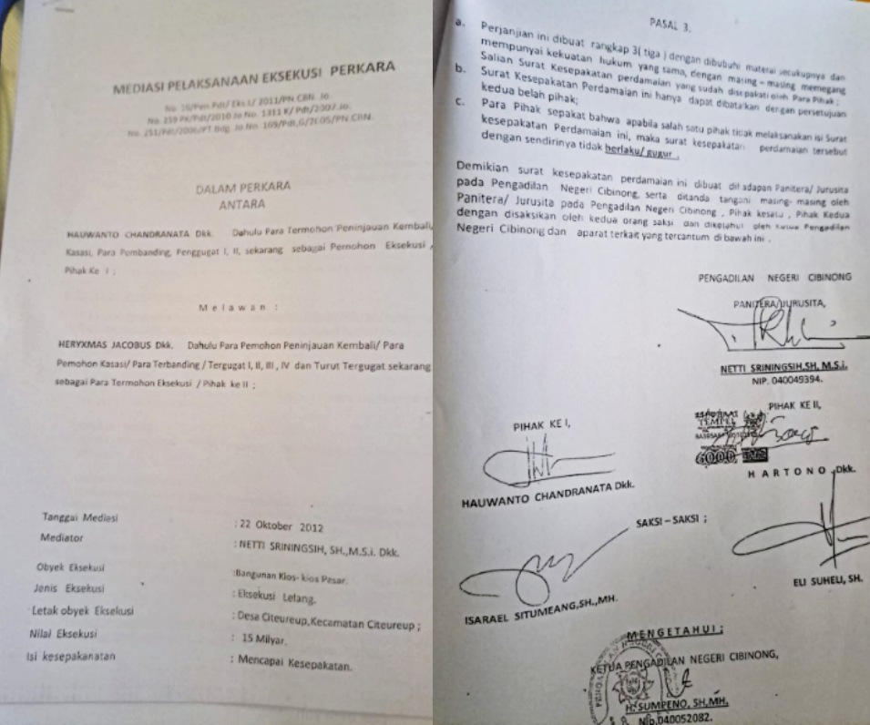 Seharusnya pihak pemenang PK sudah menerima Objek Eksekusi Pasar Citeureup 2, dari pihak yang kalah saat itu, bukan malah sebaliknya setelah ada putusan dari MA-RI, Ketua PN Cibinong dan Paniteranya saat itu, malah memediasikan pihak yang menang dengan pihak yang kalah.
