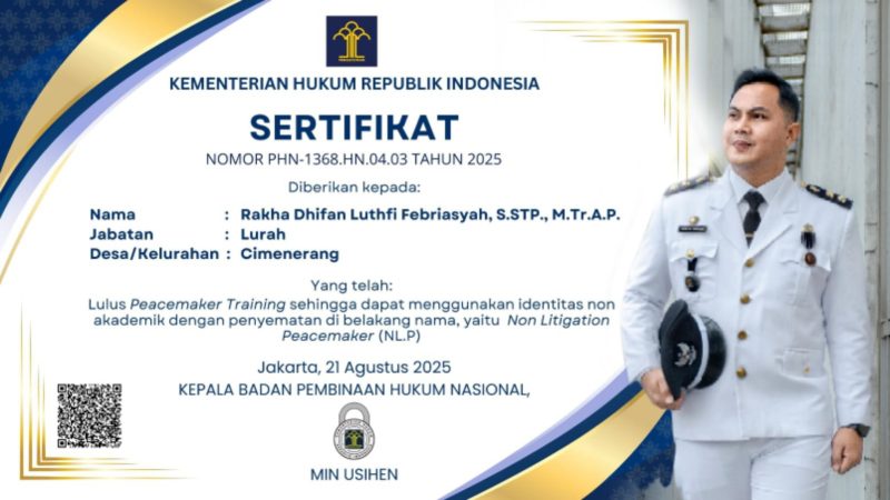Bandung, MNP – Lurah Cimincrang, Rakha Dhifan L.F., S.STP., M.Tr.A.P., kini resmi menyandang gelar non-akademik N.L.P. (Non-Litigation Peacemaker).