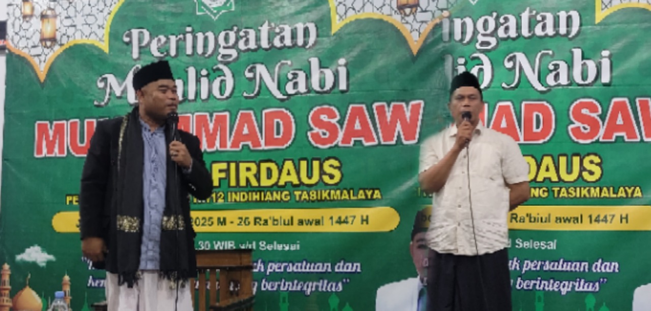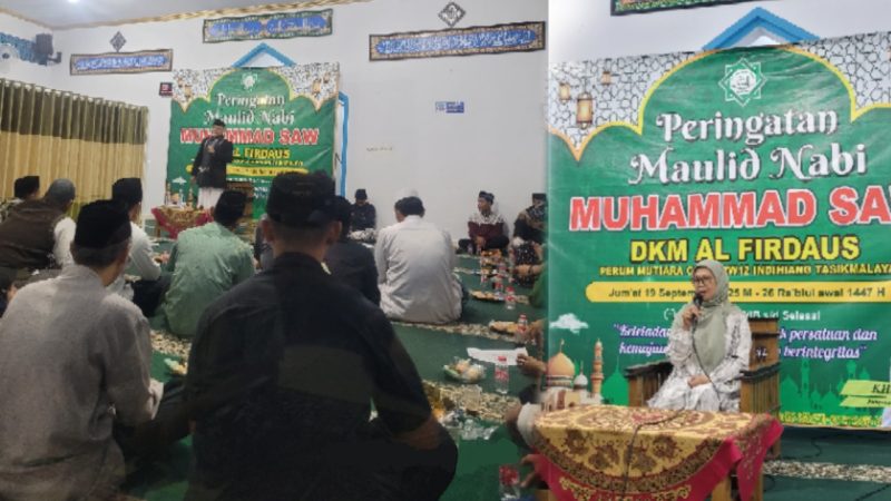 Tasikmalaya, MNP – Peringatan Maulid Nabi Muhammad SAW di Masjid Al-Firdaus, Perumahan Mutiara Citra, Kelurahan Sukamaju Kidul, Kecamatan Indihiang, Kota Tasikmalaya berlangsung meriah dan penuh khidmat, Kamis (19/09/2025).