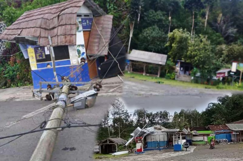 Tak hanya itu, sejumlah pohon roboh, bahkan warung dan dua rumah dinas ikut hancur tertiup ganasnya angin.