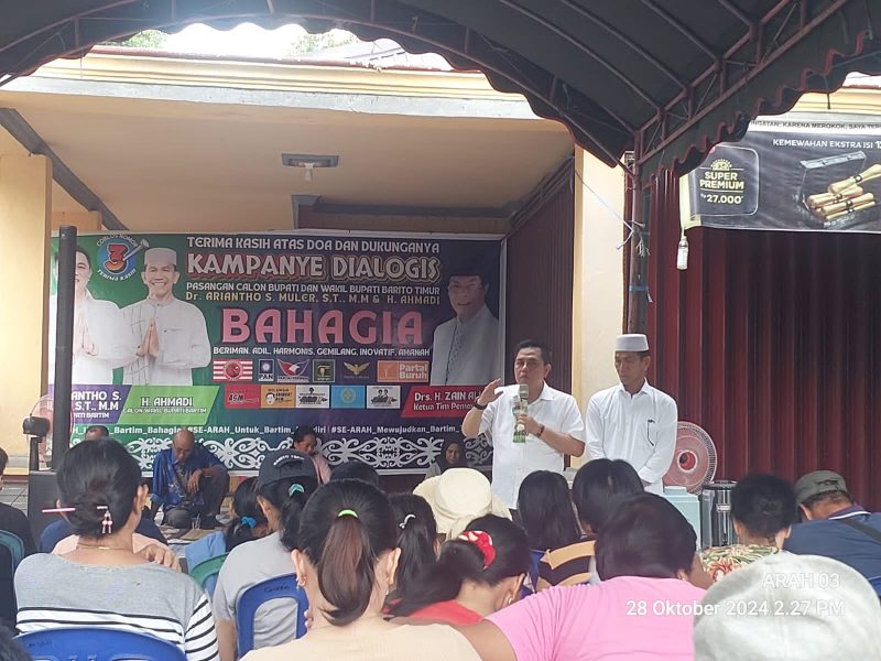 Barito Timur, MNP – Kampanye Dialogis Pasangan Calon (Paslon) Bupati dan Wakil Bupati Kabupaten Barito Timur Nomor urut 3, Dr Ariantho S Muller ST MM – H Ahmadi (ARAH) melanjutkan Kampanye Dialogis yang digelar di Desa Kandris, Ipu Mea dan Desa Wuran Kecamatan Karusen Janang.
