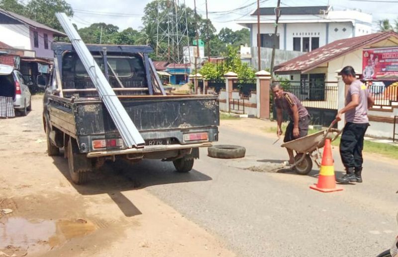 Didasari hal tersebut, personel Polsek Dusteng melakukan penambalan jalan berlubang tepatnya di depan Mako Polsek jalan Ampah – Buntok.