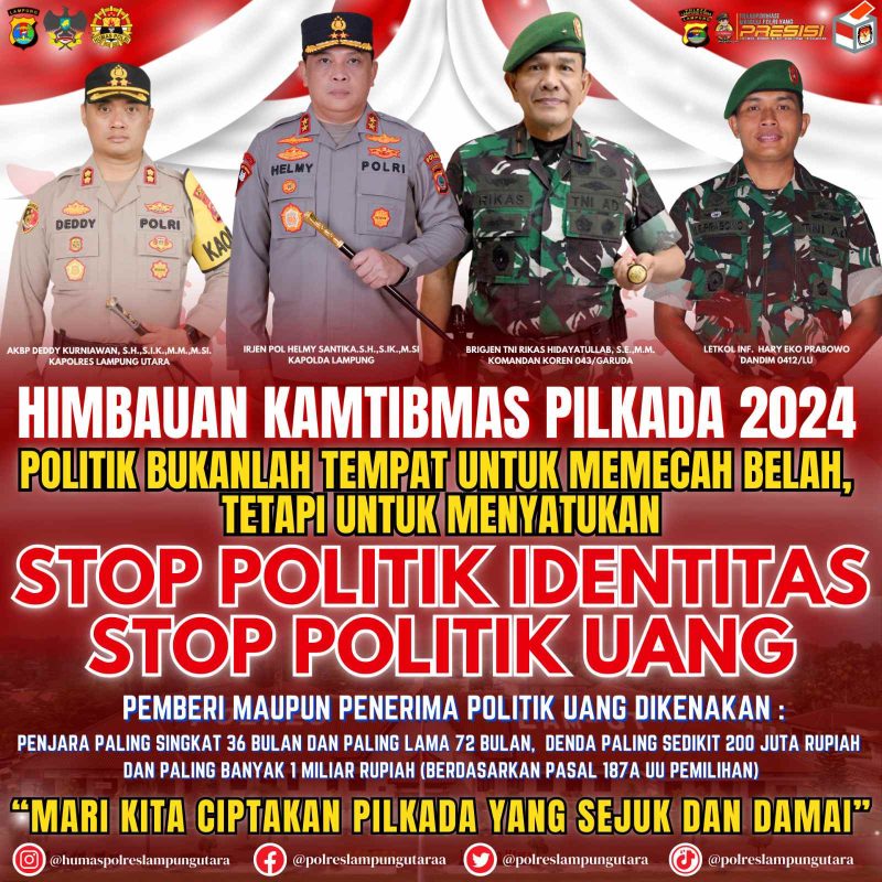 Lampung Utara, MNP – Menjelang Pemilihan Kepala Daerah serentak pada tanggal 27 November 2024 mendatang, Polres Lampung Utara menghimbau masyarakat untuk menghindari Politik Identitas dan Politik Uang.