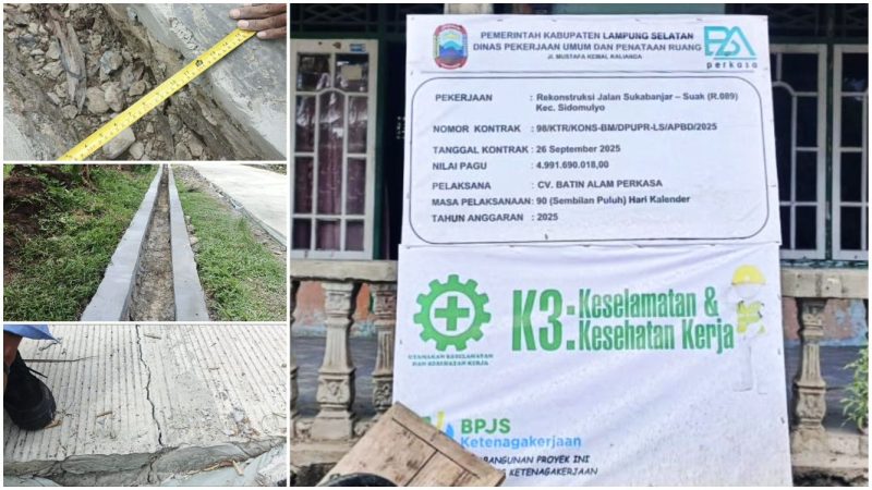 Lamsel, MNP – Proyek Rekonstruksi Jalan Sukabanjar–Suak (R.089) di Kecamatan Sidomulyo, Kabupaten Lampung Selatan Provinsi Lampung yang dibiayai APBD Tahun Anggaran 2025 dengan nilai hampir Rp5 miliar, kini menuai sorotan keras.
