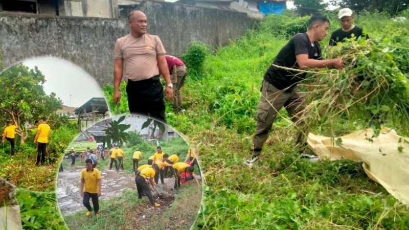 Sejak pagi, tampak sejumlah personel Polri mengenakan kaos olahraga berwarna kuning turun langsung ke area sekitar bangunan lama. Mereka membersihkan rumput liar, mengumpulkan sampah organik dan anorganik, menyapu halaman, hingga mengangkut sampah ke tempat pembuangan.