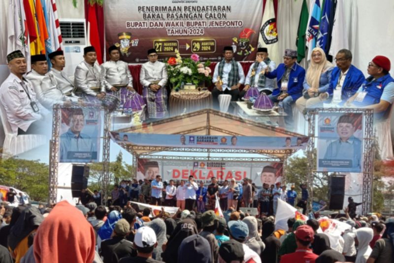 Dari pantauan MNPotret di lokasi, pasangan ini shalat berjamaah di Masjid Agung Jeneponto, berlanjut deklarasi di lapangan Parang Passamaturukang sebelum berangkat ke kantor KPU, Kamis (29/8/2024)