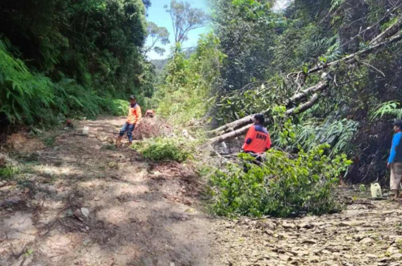 Pakpak Bharat, MNP – Para personil Badan Penanggulangan Bencana Daerah Pakpak Bharat berupaya menormalisasi jalan penghubung Salak-Pagindar setelah sempat terputus total akibat pohon tumbang yang melintang di jalan utama menuju kecamatan Pagindar ini, Minggu (02/03/3035).l