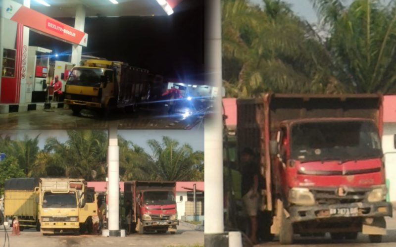 Terlihat beberapa kendaraan seperti truk bak kayu yang ditutupi terpal berwarna kuning, mobil jenis Dyna merah, hingga beberapa kendaraan lainnya yang diduga keras telah dimodifikasi, tengah mengisi BBM subsidi.