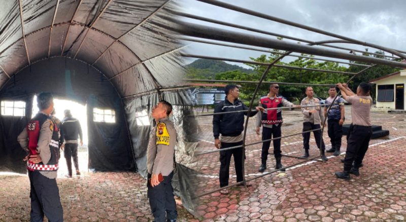Selanjutnya Personil Sat Samapta mengeluarkan peralatan dari Gudang Bag Log berupa Tenda lapangan dan langsung memasangnya/mendirikannya di lapangan Apel Mapolres Pakpak Bharat.
