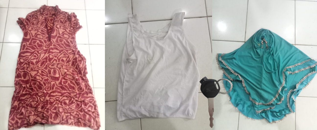 Selain mengamankan para pelaku, pihak kepolisian juga mengamankan beberapa barang bukti penting, antara lain 1 buah kunci sepeda motor Honda Beat, 1 buah kerudung warna biru muda dan 1 potong daster warna cokelat tua serta 1 potong pakaian dalam (tanktop) wanita warna putih.