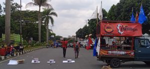 Tasikmalaya, MNP – Sejumlah Serikat Buruh menggelar aksi bersama untuk kenaikan upah 15 % Kota Tasikmalaya di depan balekota Tasikmalaya, Senin (27/11/2023).