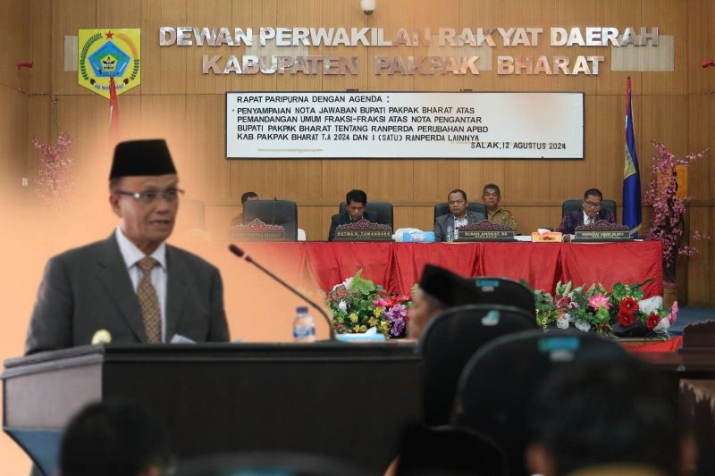 Pakpak Bharat, MNP – Wakil Bupati H Mutsyuhito Solin, Dr, M.Pd hari ini menyampaikan Pidato Nota Jawaban Bupati Pakpak Bharat atas Pemandangan Umum Fraksi-fraksi terhadap Nota Pengantar Bupati Pakpak Bharat tentang Ranperda Perubahan APBD Kabupaten Pakpak Bharat Tahun Anggaran 2024 dan 1 Ranperda Lainnya.