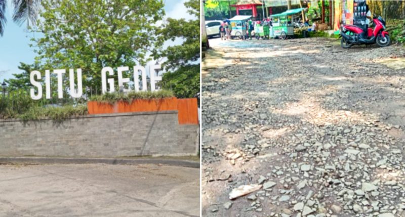 Pantauan di lapangan menunjukkan bahwa akses jalan menuju area Situ Gede rusak parah. Permukaan jalan dipenuhi batu-batu besar dan lubang yang membuat kendaraan sulit melintas.
